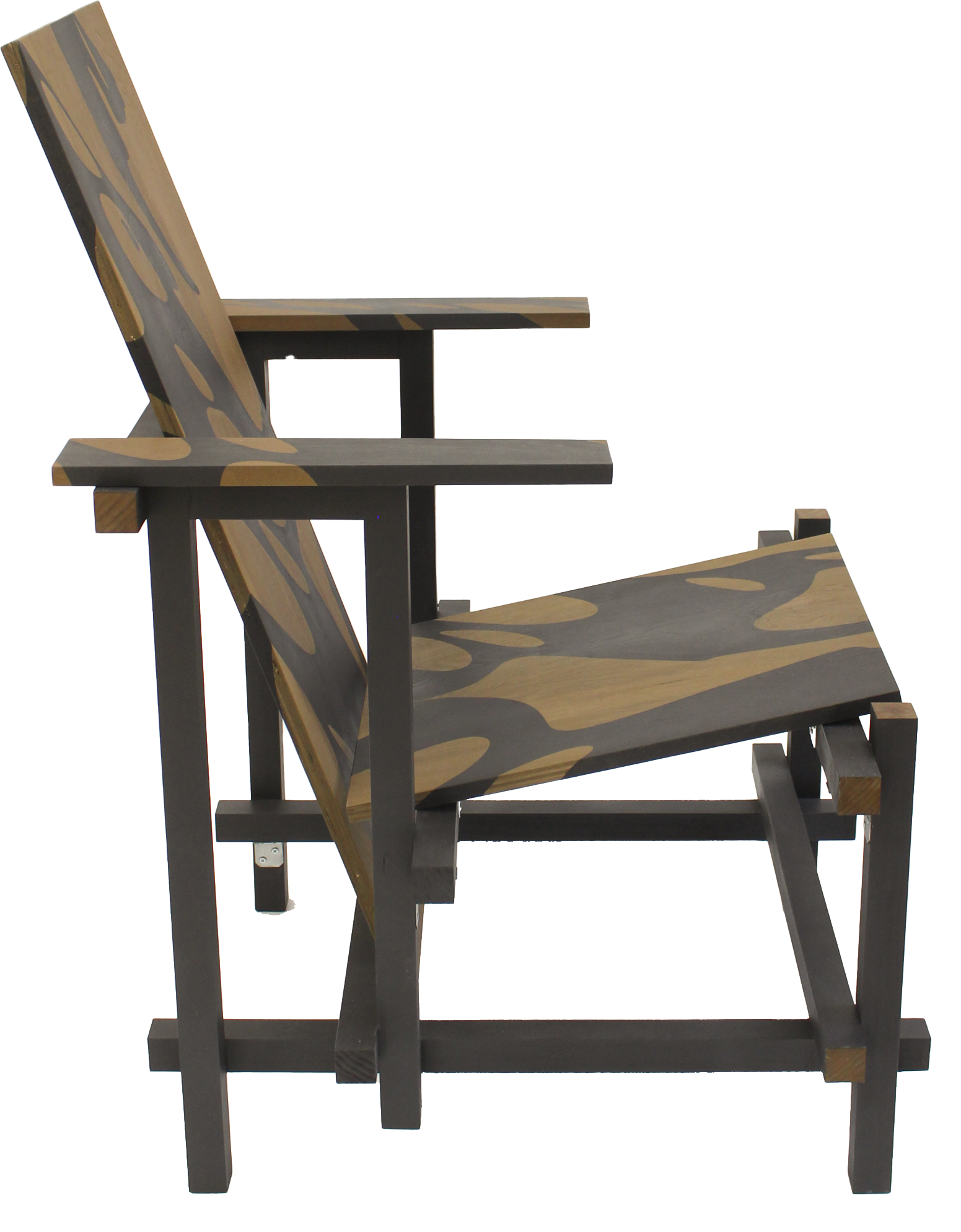 The iconic form of Dutch architect Gerrit Rietveld’s “Red and Blue Chair” is critiqued in 2 ways. The first way is by myself. I contrast the rigid structure of this austeire chair by bringing it to life with a gestural butterfly design that sweeps across. The wood is ebonized with a naturally brewed solution to give it a rich color. After staining, I screen-printed/hand-painted my design with oil-based enamel paint that wraps completely around every piece of the chair. Every shape in the design is connected across the form.